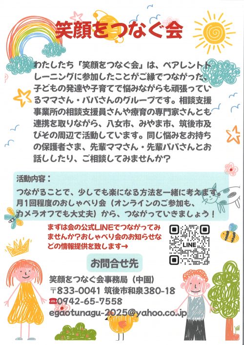 •  八女市障がい者基幹相談支援センター  > 新着情報 > 【地域からの情報】『笑顔をつなぐ会』のおしらせ